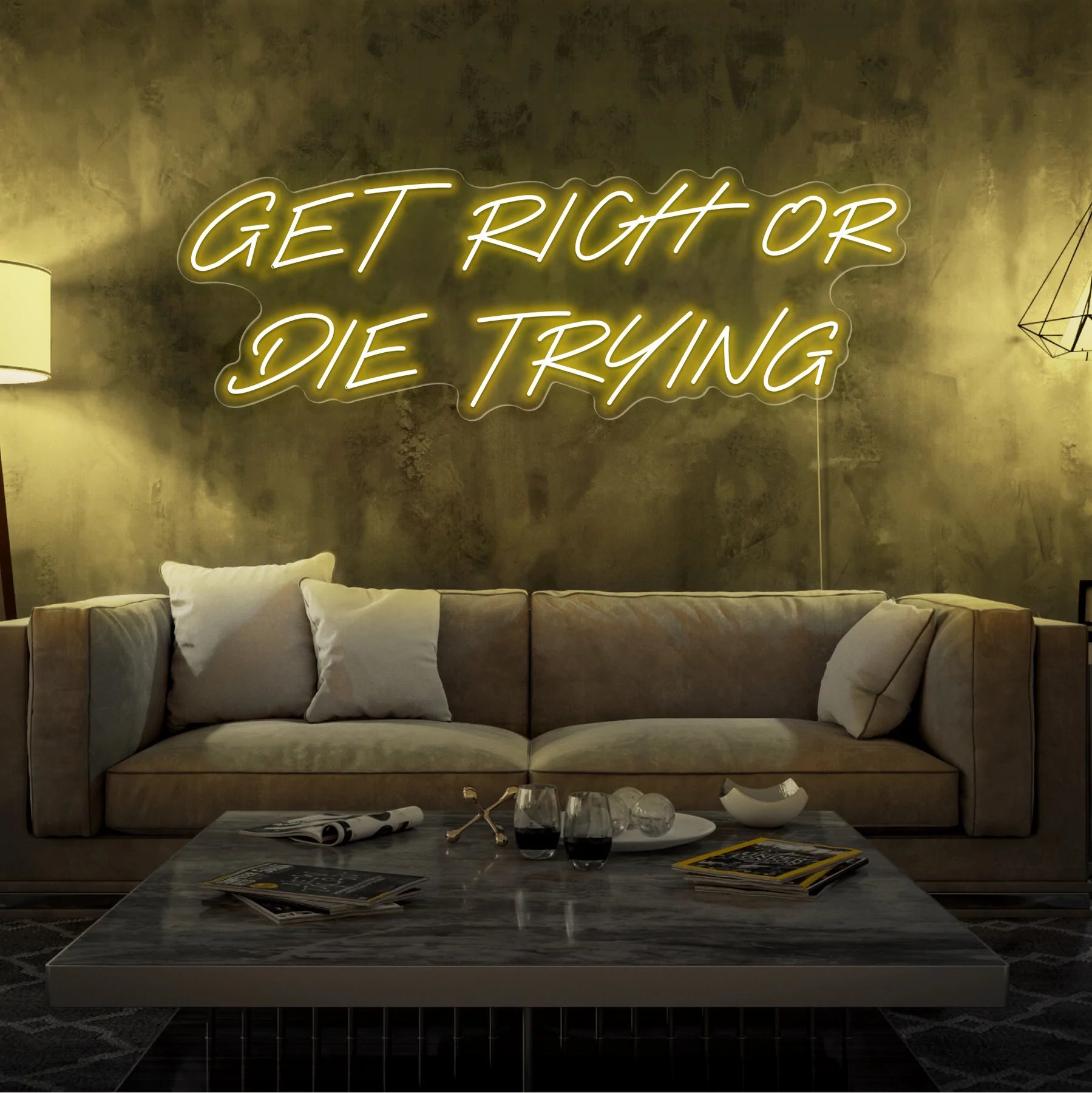 Scritta a Led Personalizzata Frasi Personalizzate “Get Rich or Die Trying” cm 120 x 50, stampata all’interno di un supporto in plexiglass, il prodotto viene accessoriato con un cavo di alimentazione della lunghezza di 200 cm con presa corrente 220V.