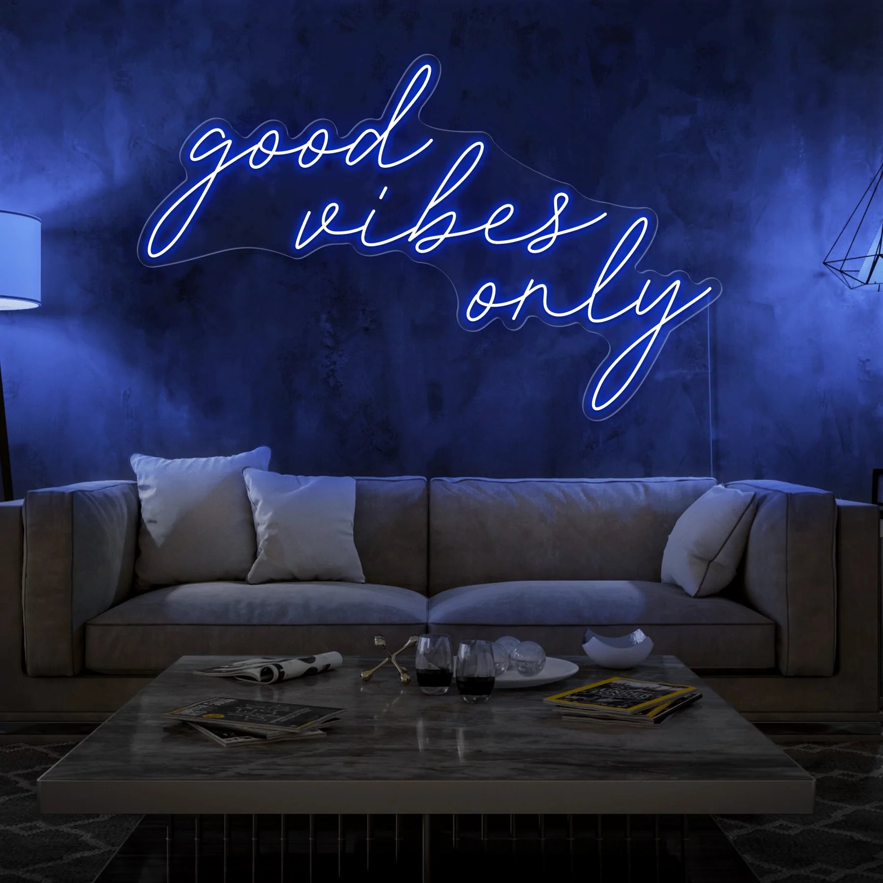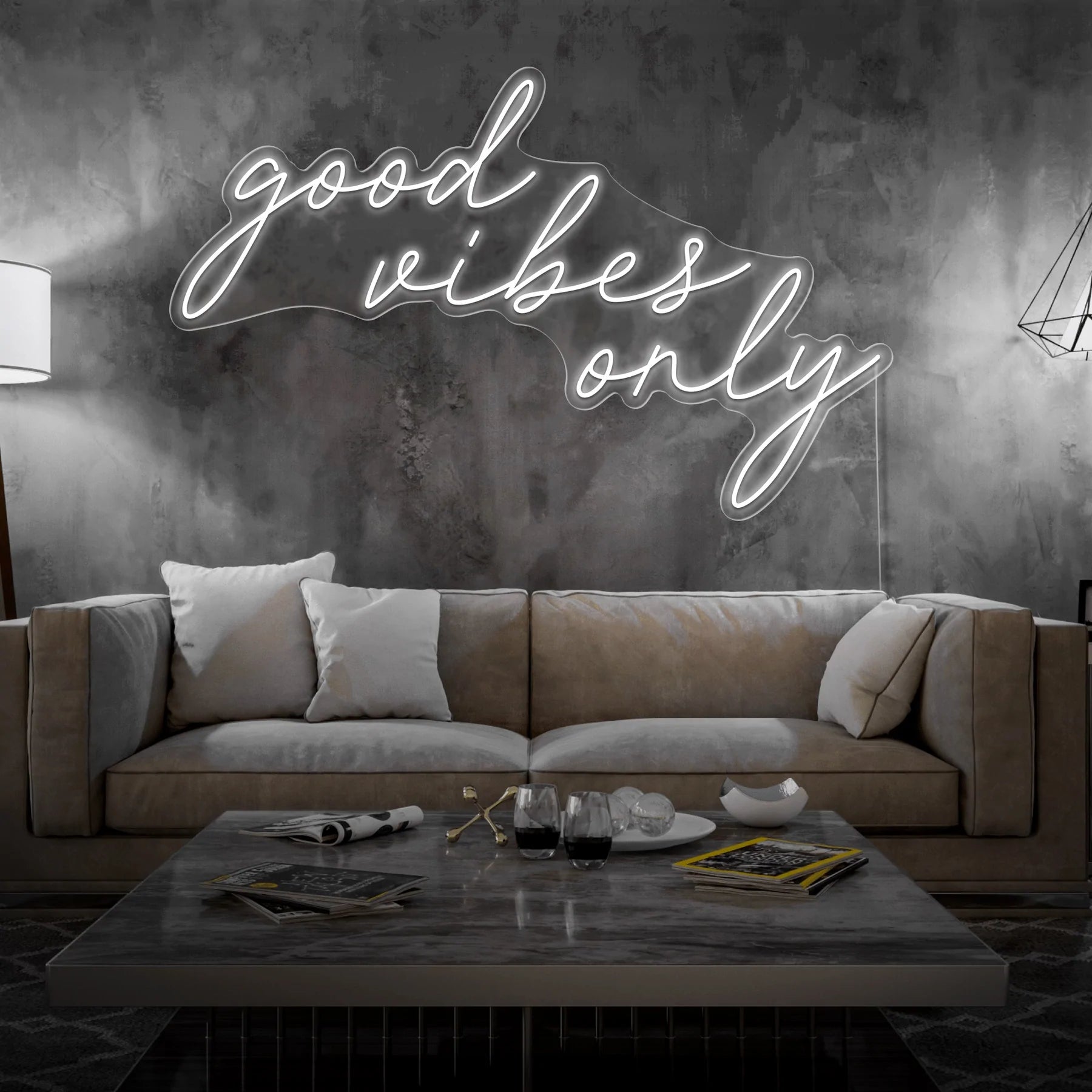 Scritta a Led Personalizzata Frasi Personalizzate “good vibes only” cm 130 x 40, stampata all’interno di un supporto in plexiglass, il prodotto viene accessoriato con un cavo di alimentazione della lunghezza di 200 cm con presa corrente 220V.