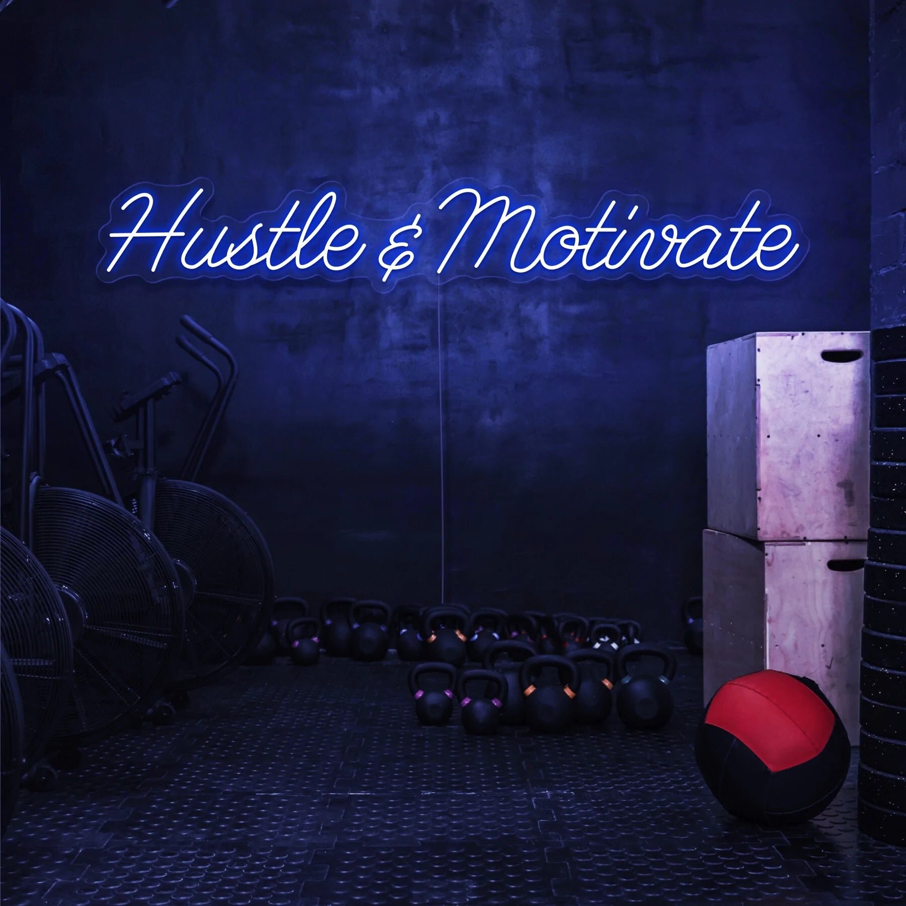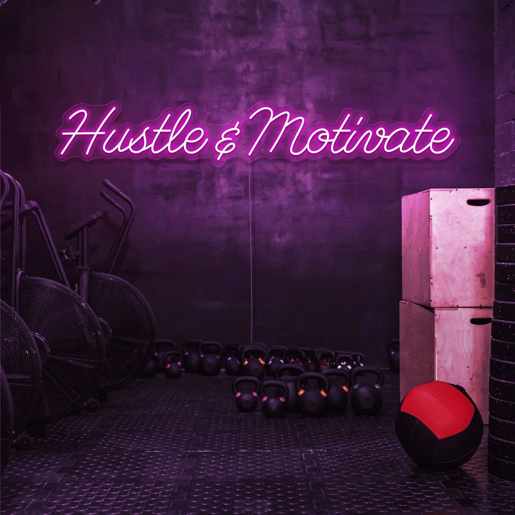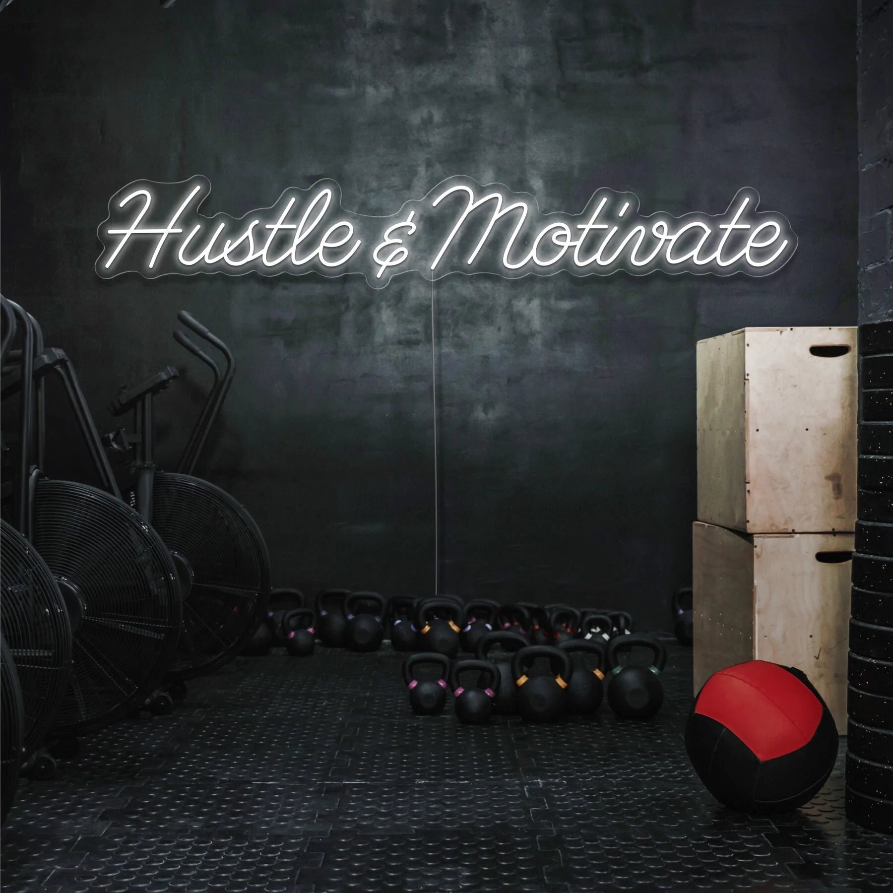 Scritta a Led Personalizzata Frasi Personalizzate “Hustle & Motivate” cm 100 x 30, stampata all’interno di un supporto in plexiglass.