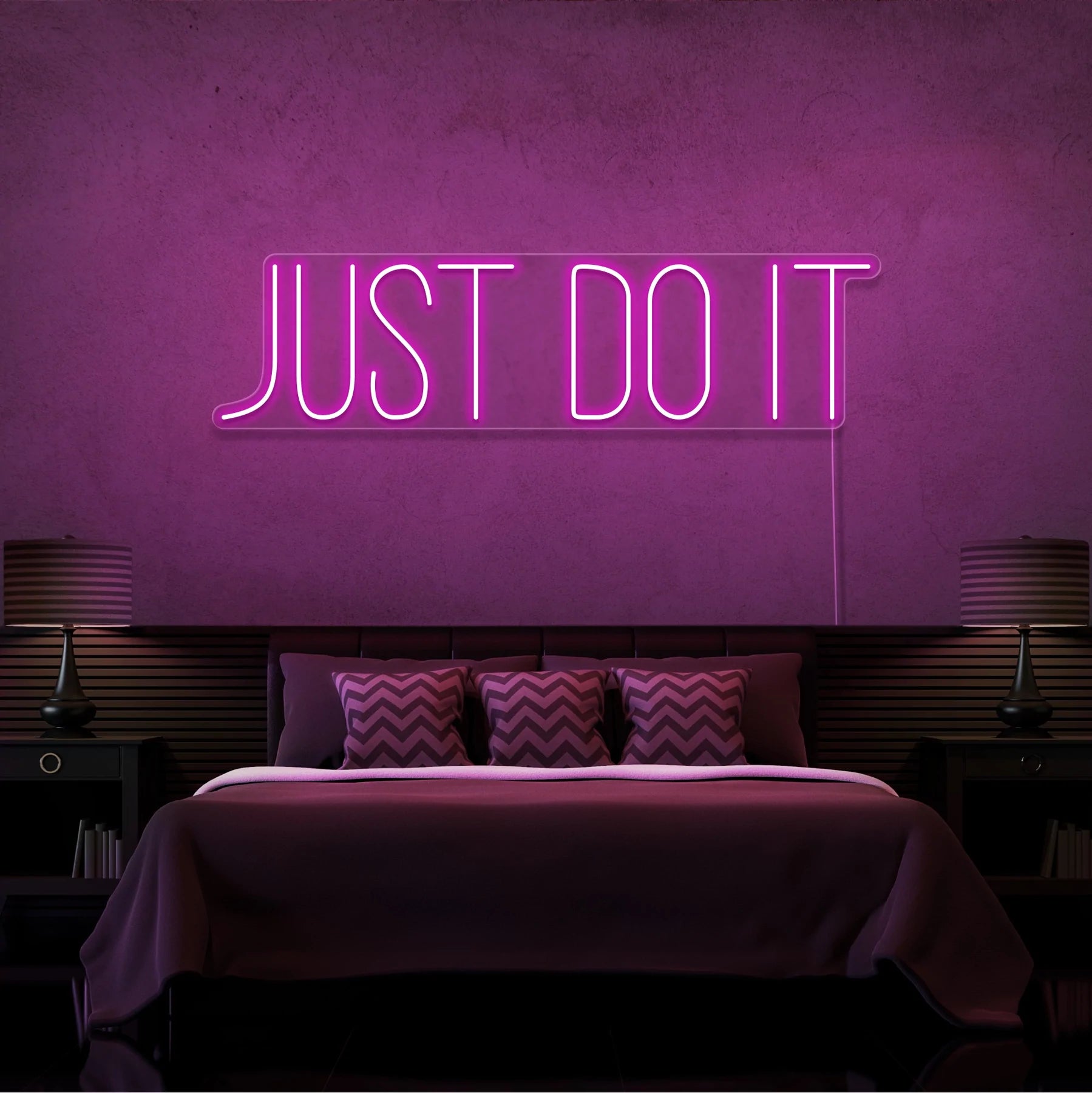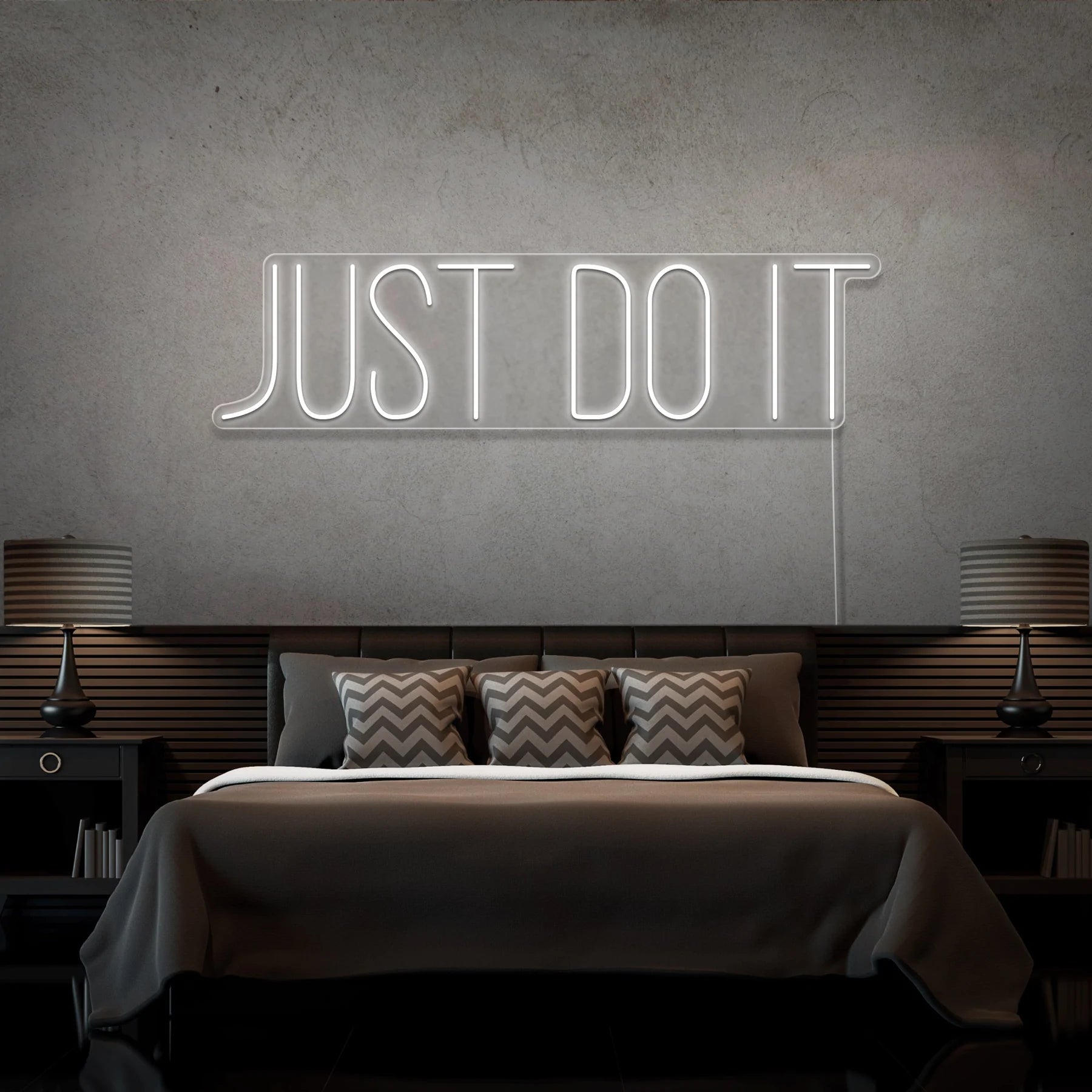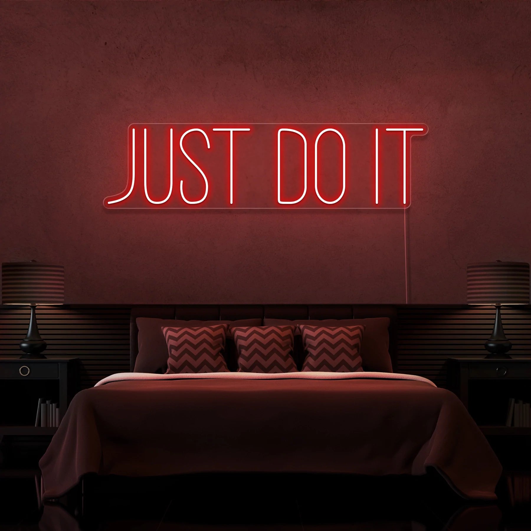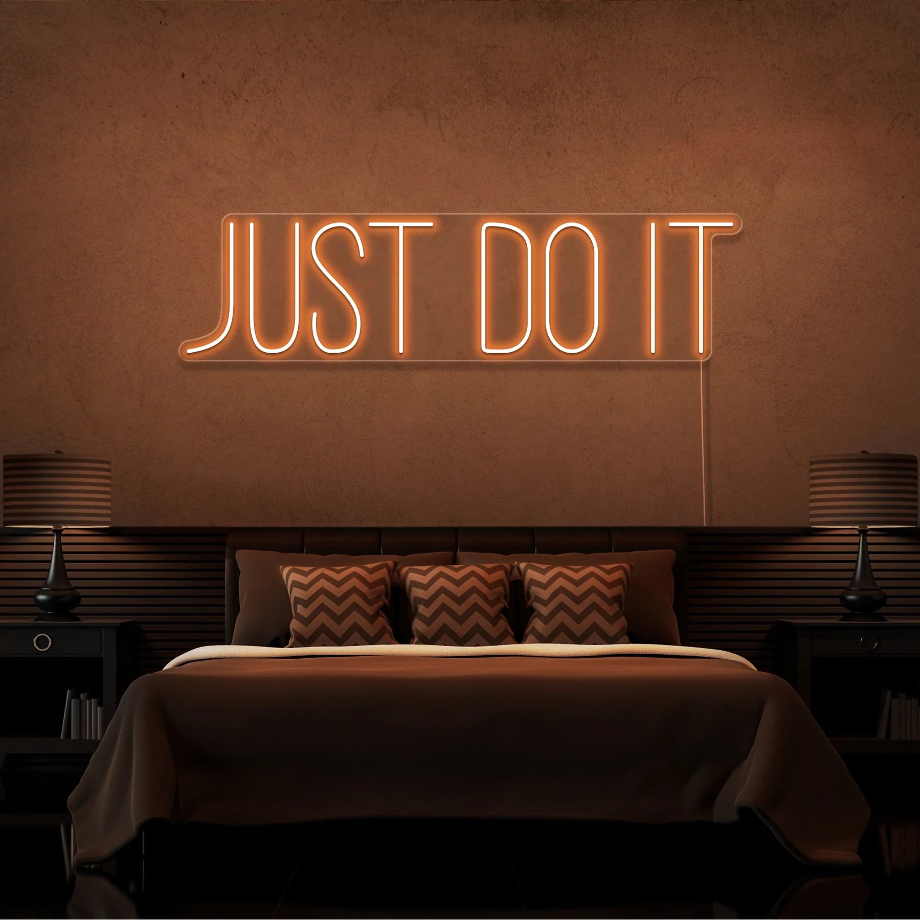 Scritta a Led Personalizzata Frasi Personalizzate “Just do it” cm 100 x 30, stampata all’interno di un supporto in plexiglass, il prodotto viene accessoriato con un cavo di alimentazione della lunghezza di 200 cm con presa corrente 220V.